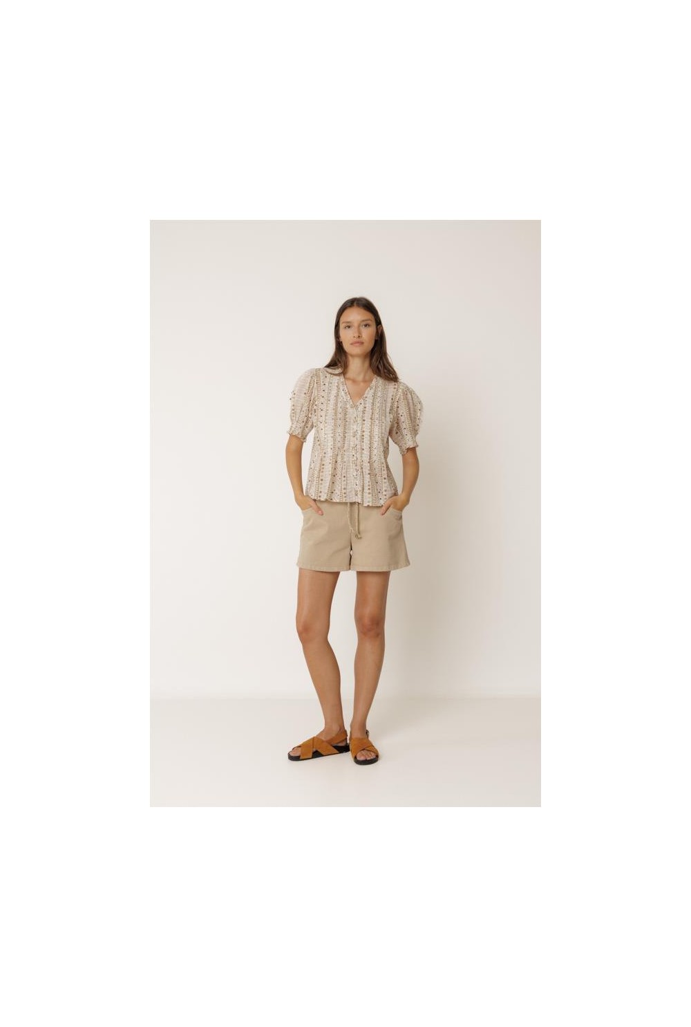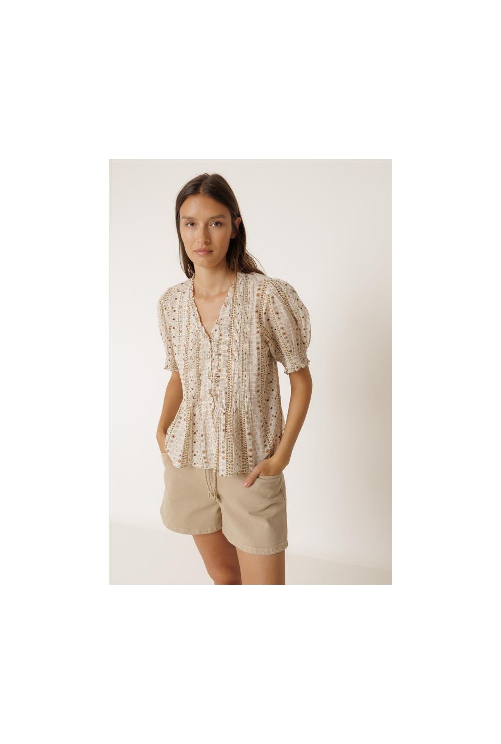 BLUSA ESTAMPADA CON DETALLES DE JARETAS. CUELLO PICO CON VOLANTE Y MANGA CORTA, PUÑO ENGOMADO. SILUETA AMPLIA CON CIERRE BOTONES. COMPOSICIÓN: 100% ALGODÓN ORGÁNICO.