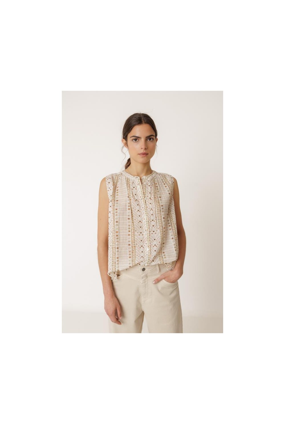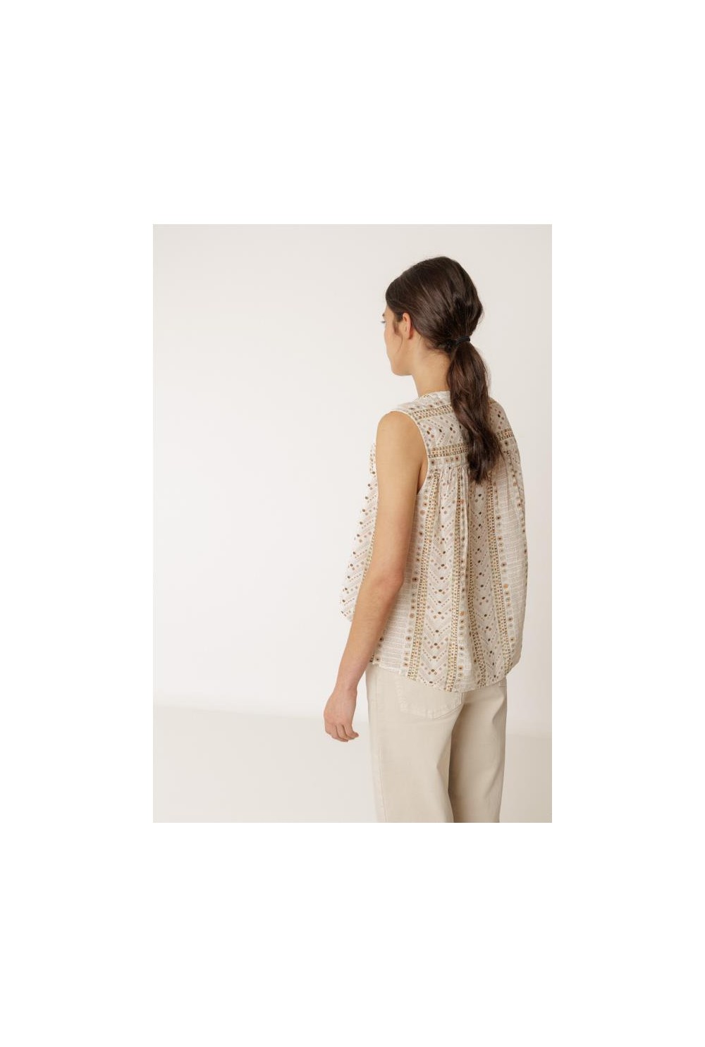 BLUSA ESTAMPADA SIN MANGAS. CUELLO REDONDO, CORTE AMPLIO Y CIERRE BOTONES. COMPOSICIÓN: 100% ALGODÓN ORGÁNICO.