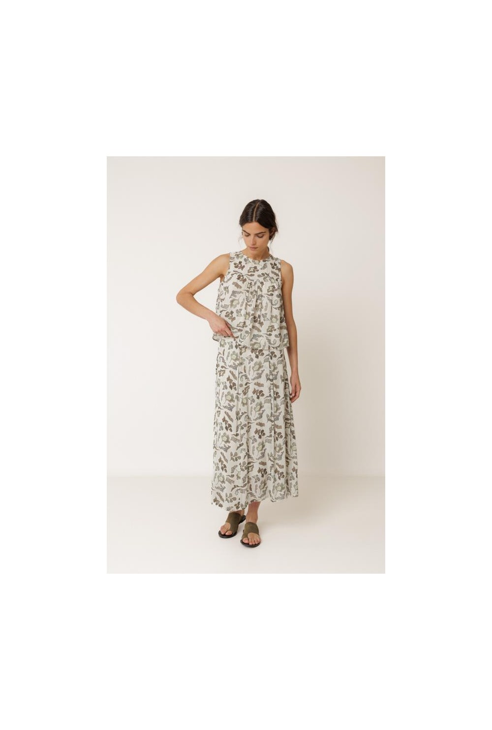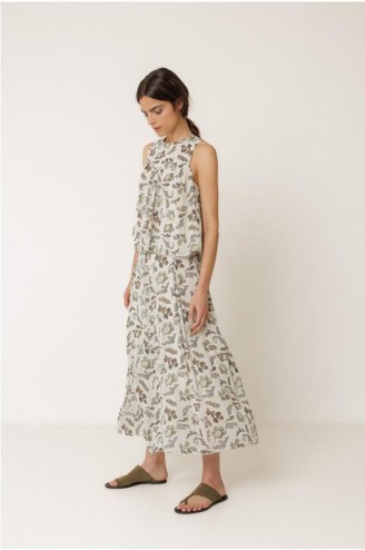 BLUSA ESTAMPADA SIN MANGAS, CUELLO REDONDO CON CIERRE BOTÓN EN ESPALDA. CORTE FLUIDO. COMPOSICIÓN: 45% VISCOSA SOSTENIBLE, 55% VISCOSA.