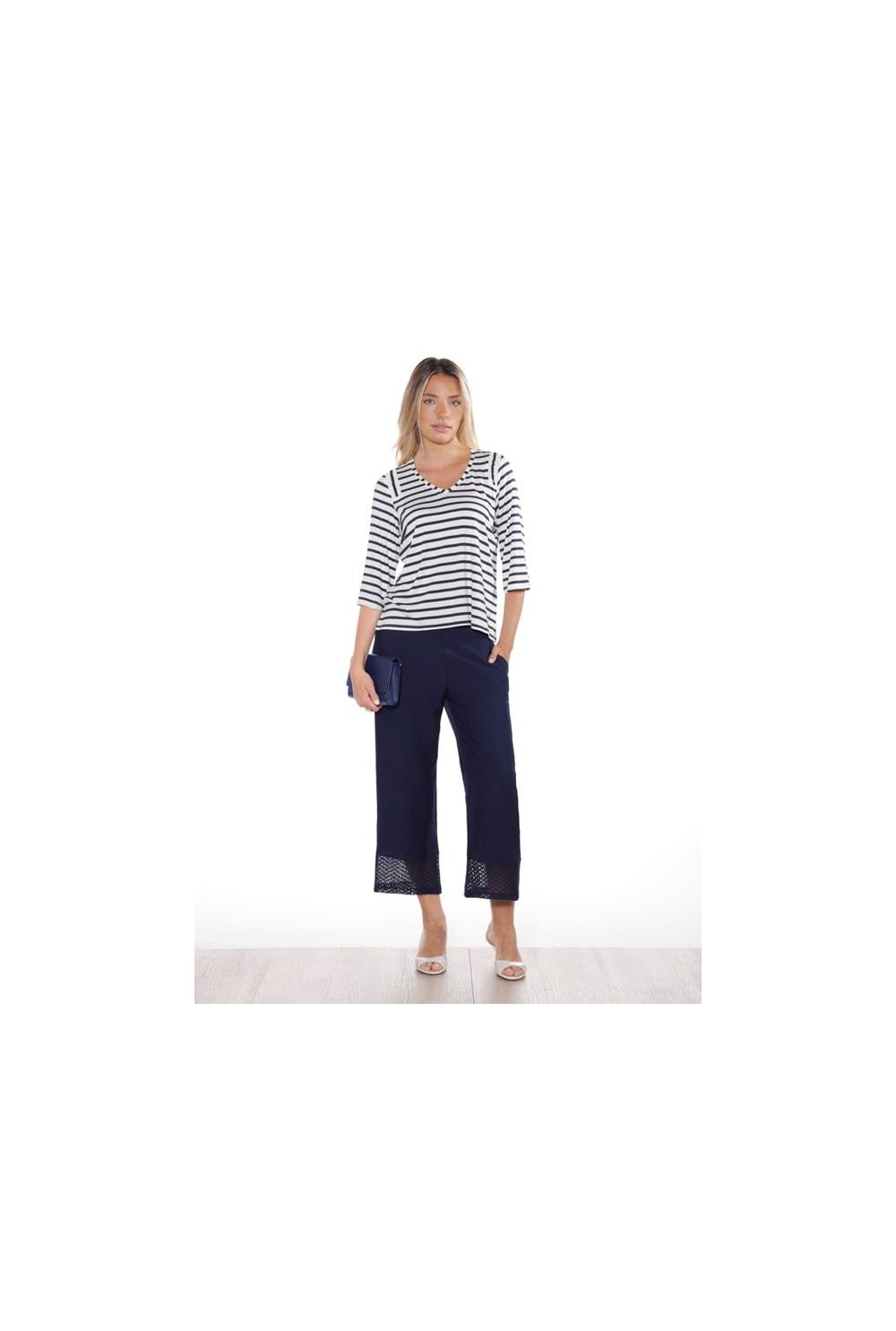 CAMISETA RAYADA DE ESCOTE PICO CON DETALLE FRUNCIDO EN HOMBRO Y MANGA FRANCESA. SILUETA RECTA CON ABERTURAS LATERALES. COMPOSICIÓN: 96% VISCOSA, 4% ELASTANO.
