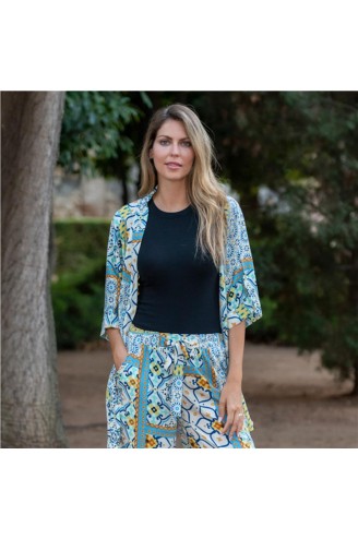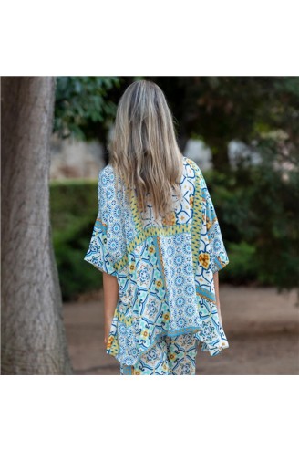 Kimono estampado. Cuello V pronunciado, manga al codo. Silueta corte fluido. COMPOSICIÓN: 100% POLIÉSTER.