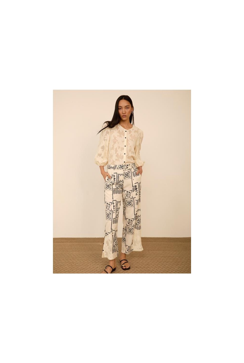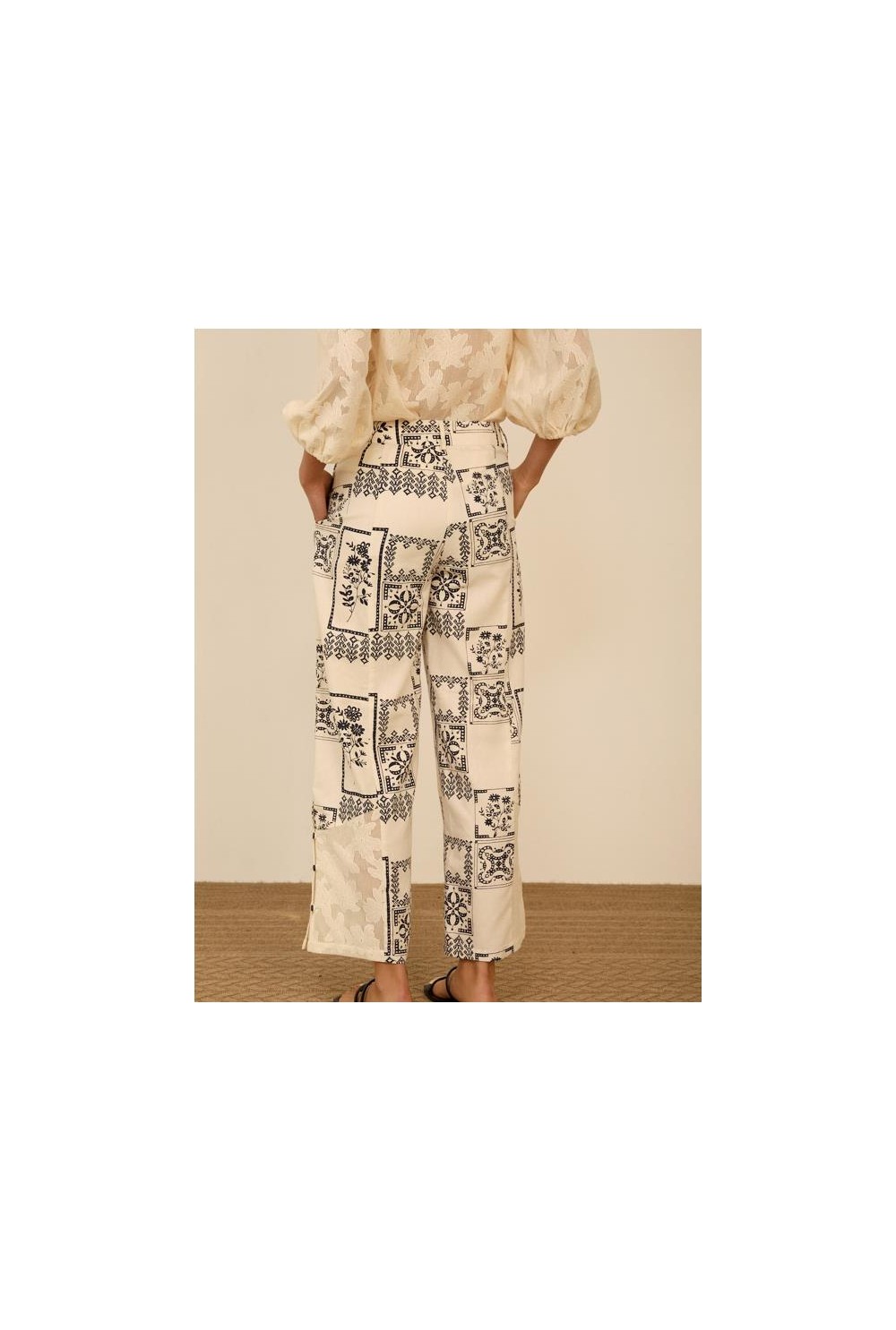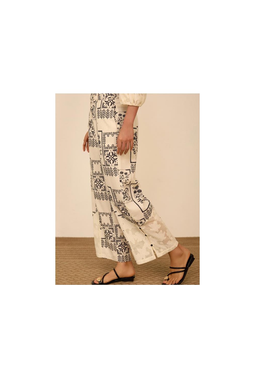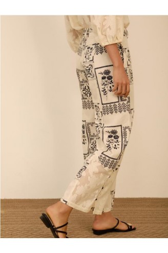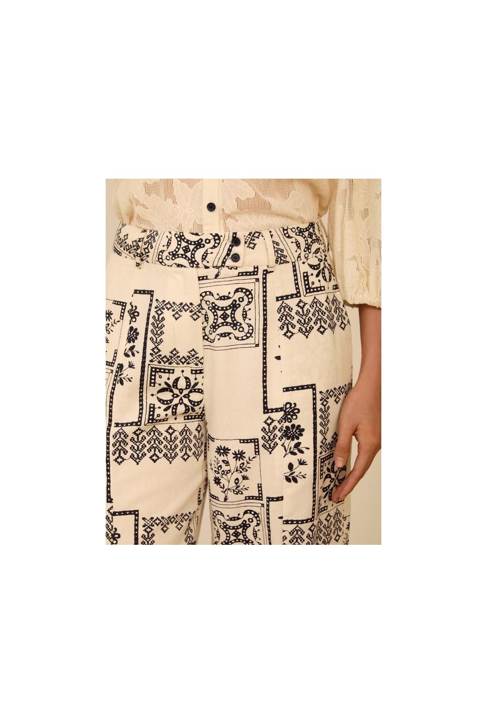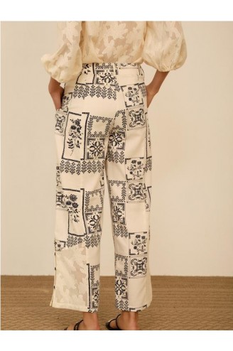 Pantalon estampado Meisie. De pierna recta y detalle de encanje con botones. Tiro alto y cierre botón con cremallera. Su tejido de algodón y tencel lo hace super liviano para verano. Composición:75% algodón, 25% tencel