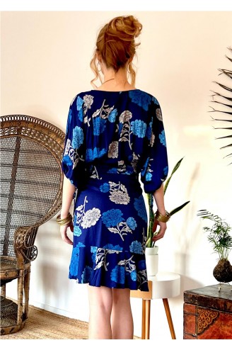 Vestido corto estampado. Escote cuello pico cruzado, manga kimono. Silueta corte a cintura, bajo con volante. No lleva forro ni cierre. COMPOSICIÓN: 100% RAYON.