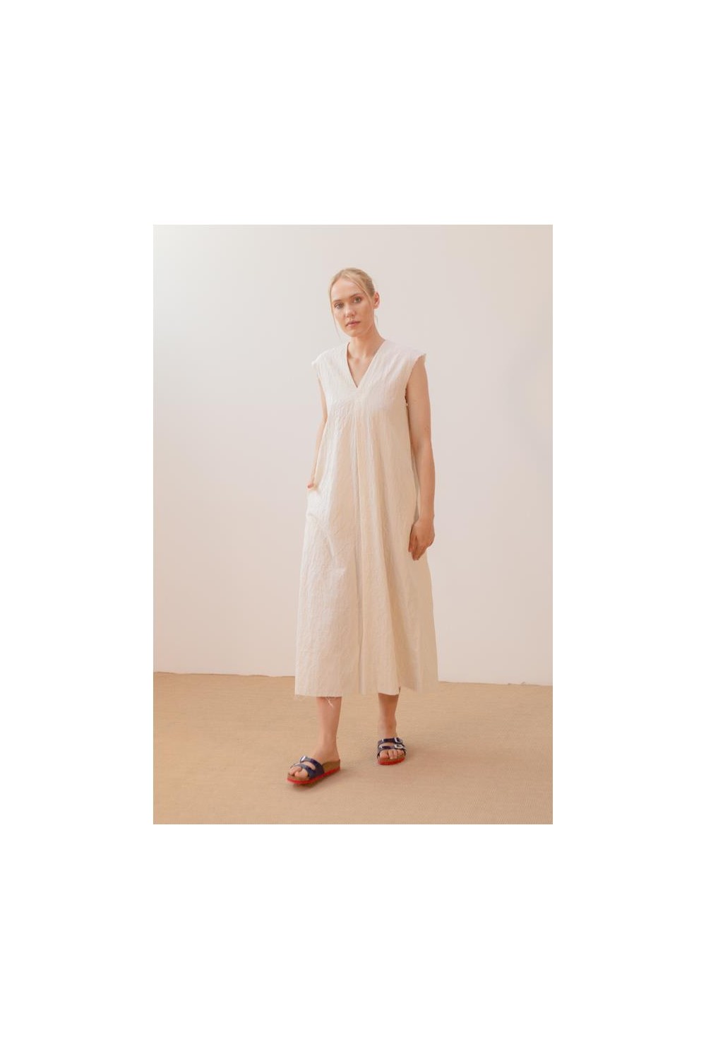 Vestido largo Pan de cuello pico y manga caída. Diseño corte fluido sobre un tejido de algodón en relieve. Incorpora bolsillos. Composición: 99% algodón, 1% elastano.